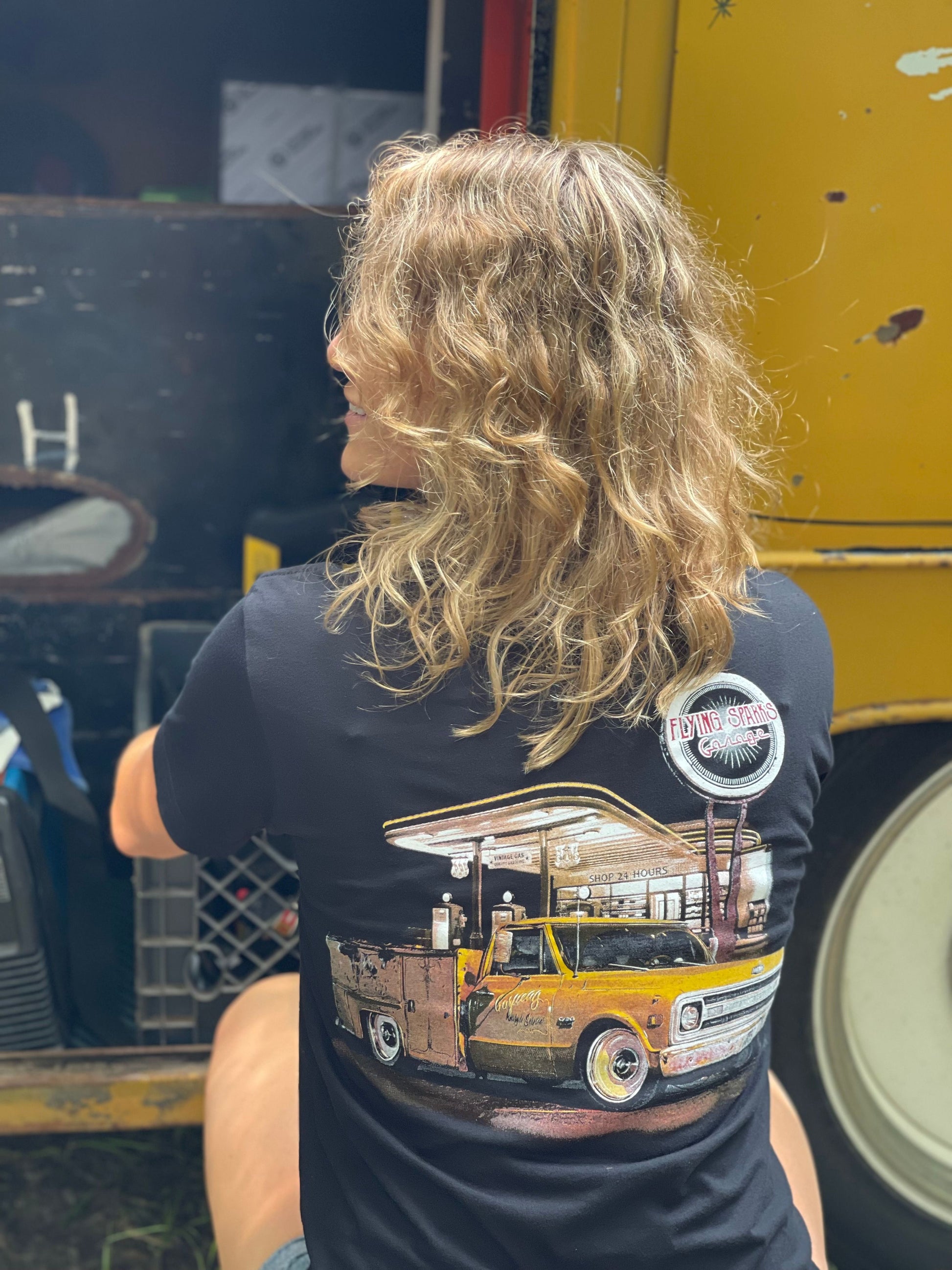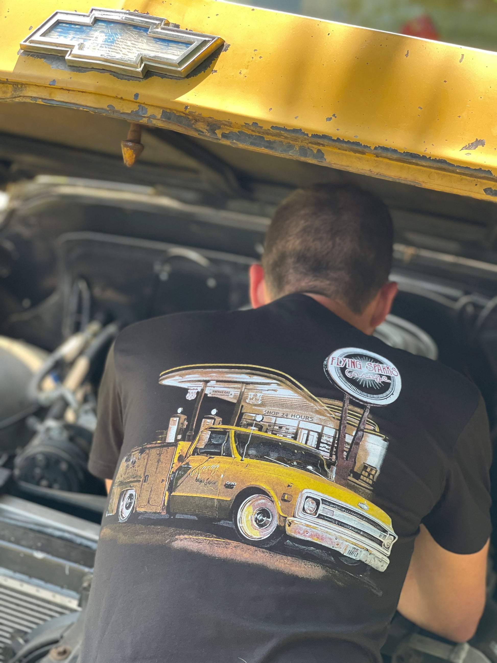 Our 1969 C20 tool truck lovingly named Garfield the Truck has the perfect potato cam and air ride drops it low and lazy! Fat and heavy with tools and road trip gear, this awesome gas station scene with your favorite tool truck is a classic shirt!